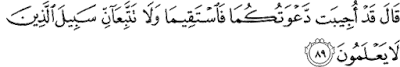 (89) Allah said: "Verily, the invocation of you both is accepted. So you both keep to the Straight Way (i.e. keep on doing good deeds and preaching Allah's Message with patience), and follow not the path of those who know not (the truth i.e. to believe in the Oneness of Allah, and also to believe in the Reward of Allah: Paradise, etc.)."