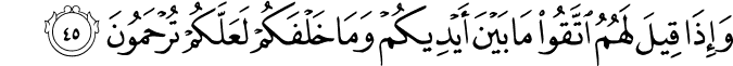 (And when it is said to them: "Fear of that which is before you, and that which is behind you...'') Mujahid said, "This refers to sins.'' Others said it is the opposite.