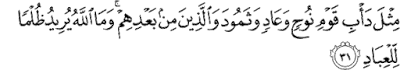 (31) "Like the fate of the people of Nuh (Noah), and 'Ad, and Thamud and those who came after them. And Allah wills no injustice for (His) slaves.